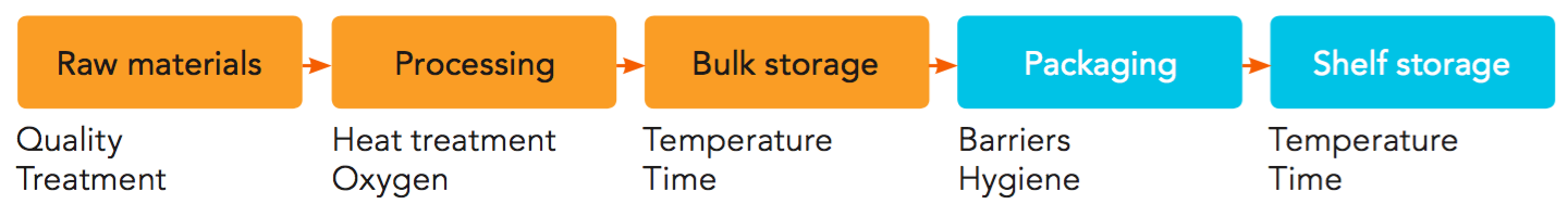 Since these conditions are an absolute prerequisite for storage at ambient temperature, product shelf life is not determined by microbiological factors but by quality changes that are due to inevitable temperature-driven reactions and oxidative reactions. The latter are directly related to the package barrier properties.