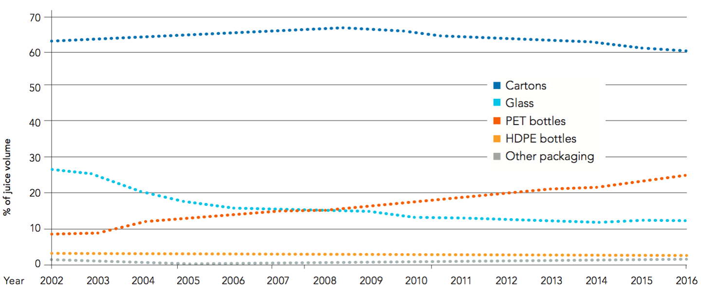 The packaging preferences for fruit juices (all flavours) in Europe can be seen in Figure 9.10.