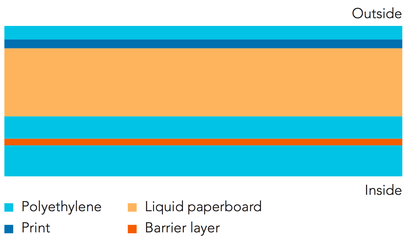 The laminated carton material normally consists of layers of paperboard coated internally and externally with polyethylene, and a barrier layer.