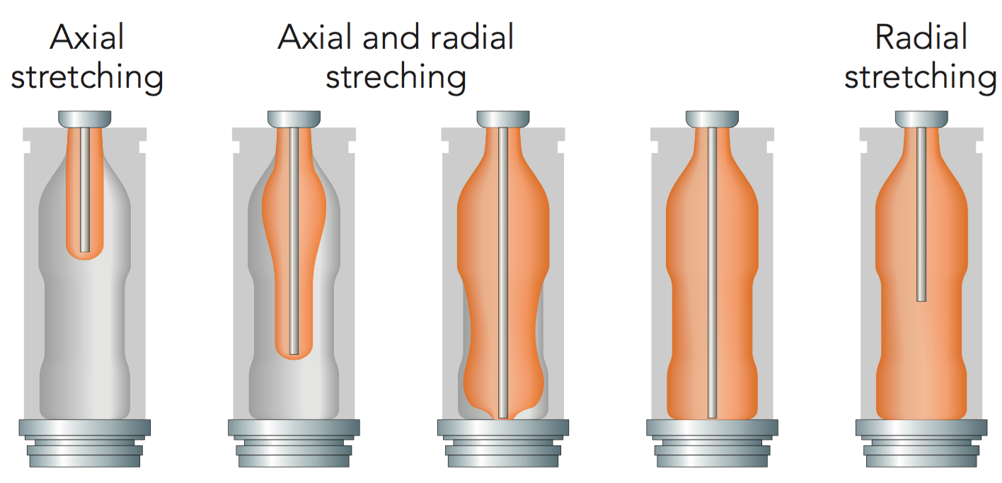 PET bottles are made by stretch blow moulding (SBM), starting with a preform. A preform is an injection-moulded PET tube closed at one end and with the finished neck at the open end. During blowing with high-pressure air, the heated preform is stretched both axially (using a stretch rod) and radially into the bottle mould (see Figure 9.16). The bi-oriented material gives the bottle high tensile strength and an increased gas barrier, which allows for lightweight bottles.