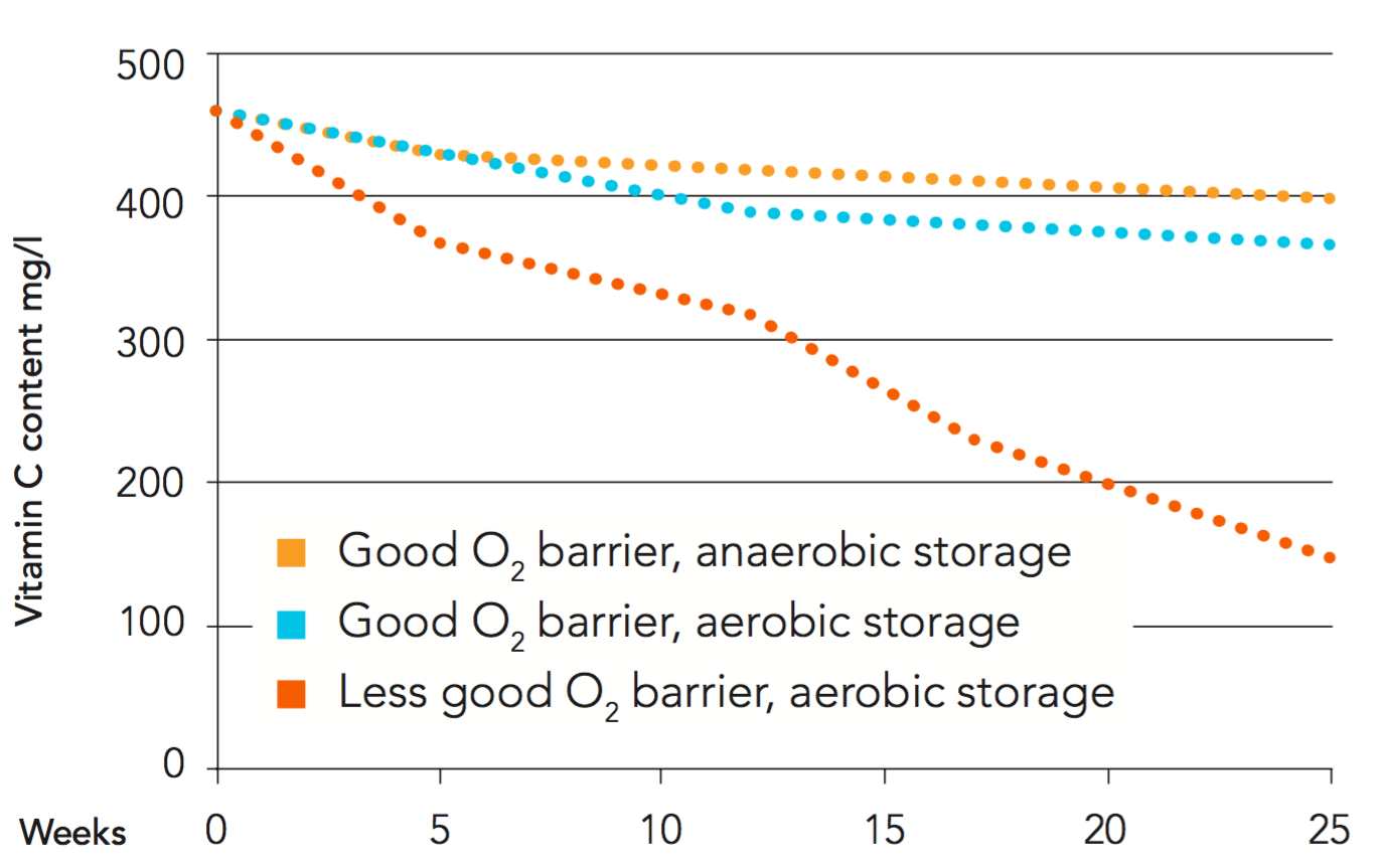 An oxygen permeability of 0.02 ml oxygen/ package/ day in a 1-litre package results in a loss of 9 mg/l vitamin C per month during ambient storage.