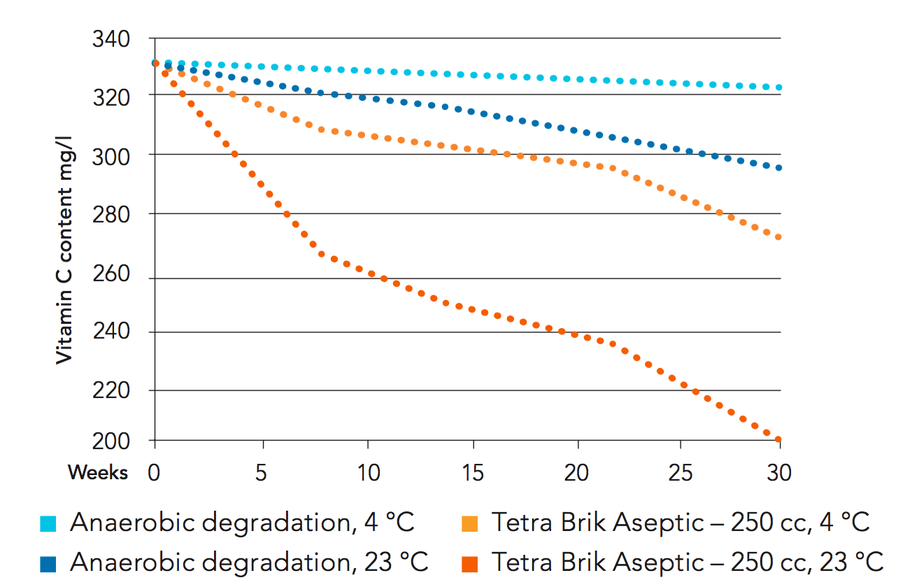 Vitamin C is the most oxygen-sensitive compound in orange juice. Its loss is thus closely related to oxygen content in packages. Generally, vitamin C is lost through two different chemical pathways – anaerobic and aerobic degradation. As its name implies, the anaerobic pathway is independent of oxygen and dependent mainly on storage temperature. Losses caused by anaerobic degradation cannot be prevented by packaging and are the same in all types of packages. The only possible counter-measure is to reduce storage temperature.