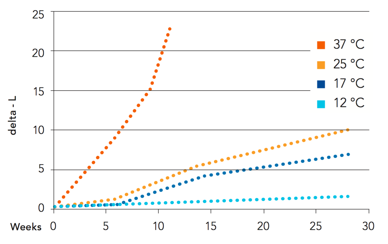 It is quite obvious that when oxygen permeability of a package exceeds a certain point, the aerobic pathway predominates. The anaerobic reaction pathway is mainly temperature-driven. The impact of temperature can be seen from the example of a 1-litre package in the fact box.