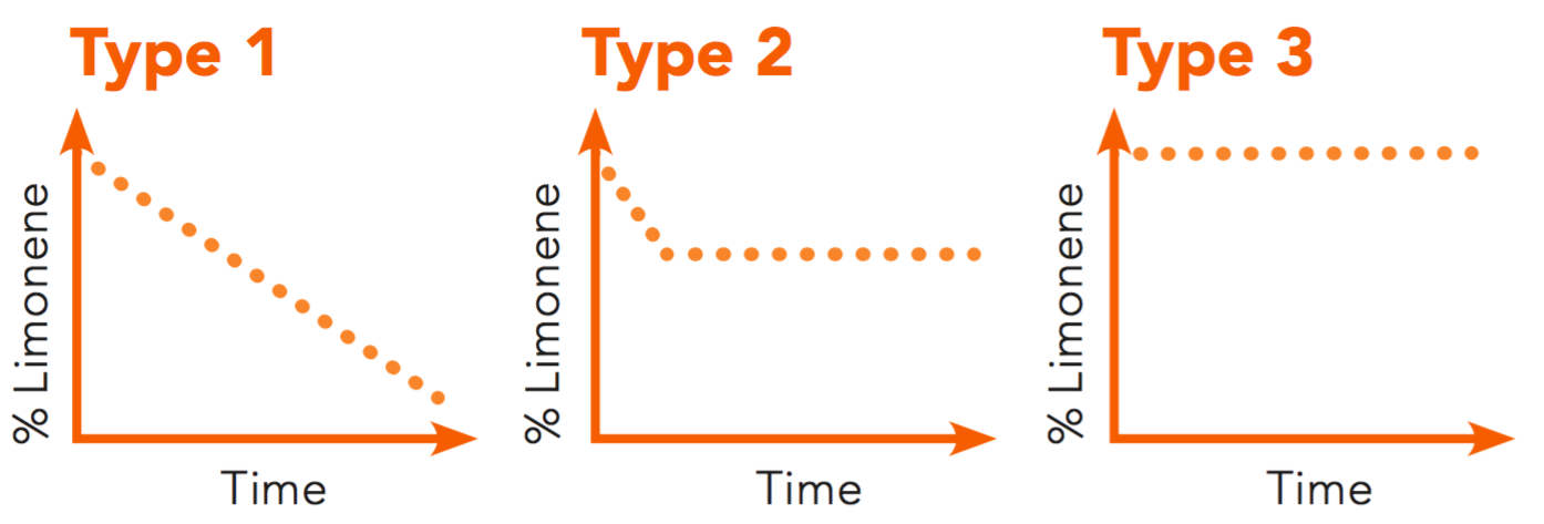 In this package, the aroma barrier is in direct contact with product and practically no limonene absorption or permeation takes place. The slight loss of limonene that occurs during storage at ambient temperature is related only to chemical degradation, which is independent of the packaging. Type 3 packages are mainly glass and PET bottles. In flexible packages, aroma-barrier polymers simultaneously used as sealing layers are sometimes more difficult to seal than polyolefins.