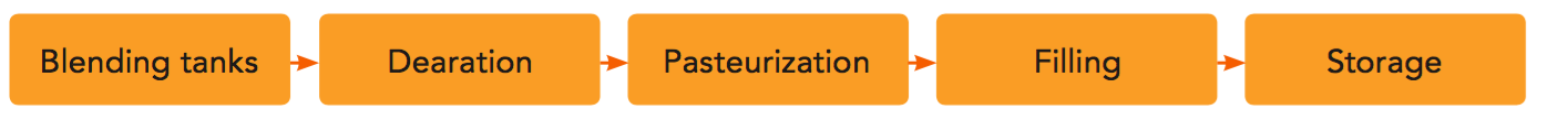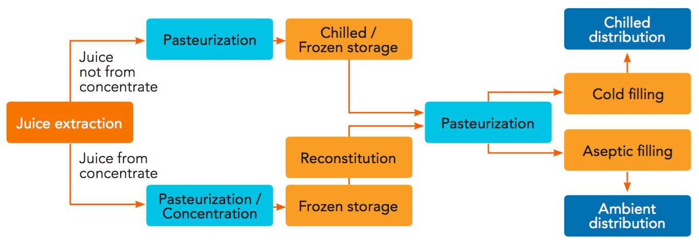 Orange juice is pasteurized at least twice before it reaches the consumer (except for a small volume of NFC that is filled directly into consumer packages after the first pasteurization). The first pasteurization occurs immediately after extraction prior to bulk storage, and the second pasteurization occurs before packaging (see Figure 4.10).