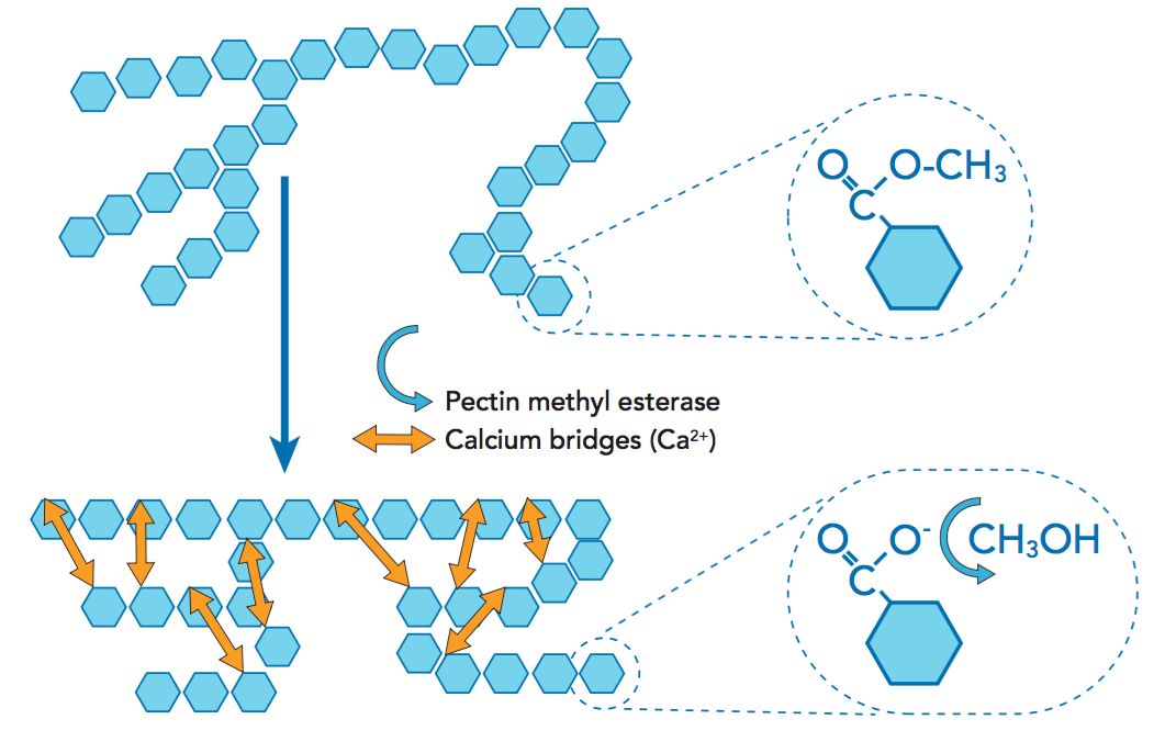 The enzyme breaks down pectin by removing methyl groups from the sugar units. The resulting molecule reacts with calcium (naturally present in the juice) to create bridges between the sugar units, see Figure 4.13. The insoluble molecule formed is called calcium pectate. In single-strength juice, calcium pectate settles to the bottom of the package. This causes the juice to separate into a clear upper phase and a lower sediment phase. This separation is referred to as cloud loss.