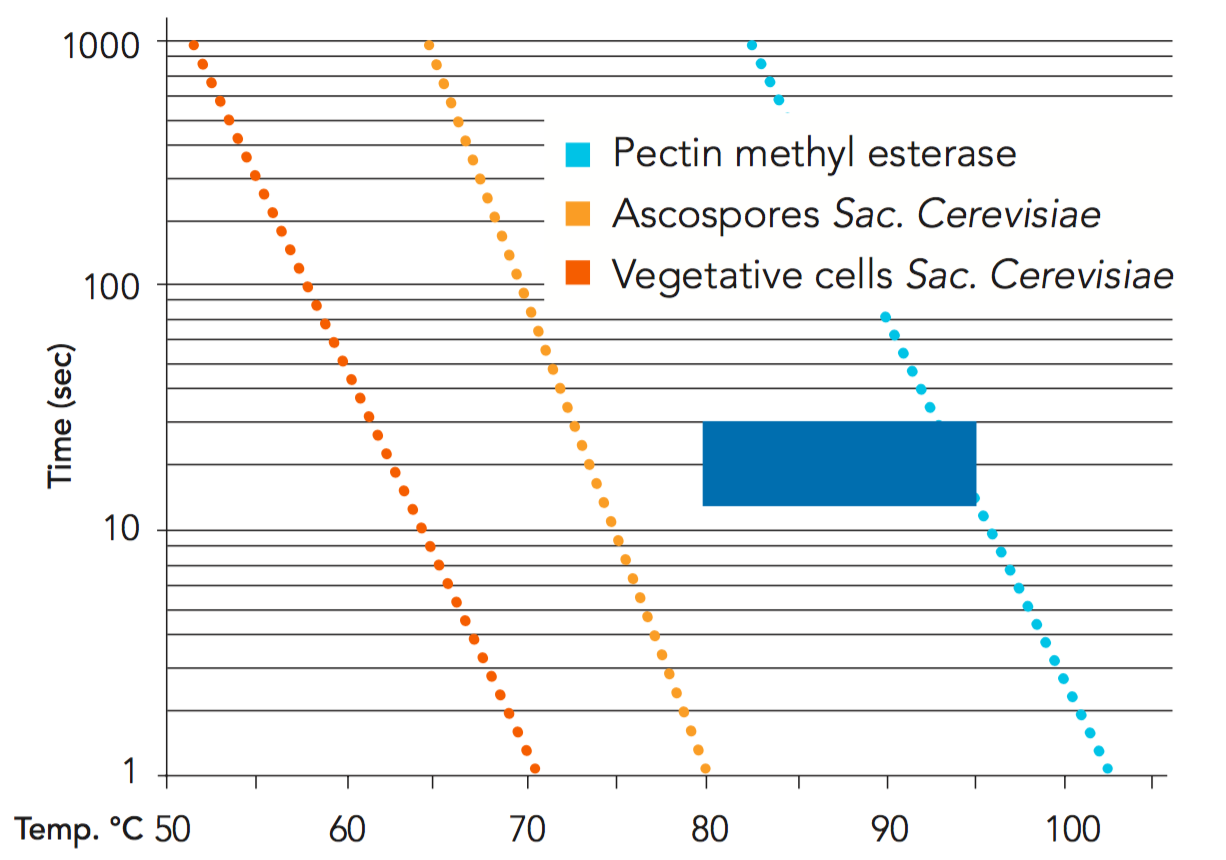 Figure 4.14 shows the theoretical thermal destruction curves of pectin methyl esterase, and of ascospores and vegetative cells of Sac. cerevisae in orange juice. All temperature/time combinations to the right of the ascospore curve are sufficient for 10 decimal reductions or more. The blue square shows the time/temperature combinations used mainly by the industry today.