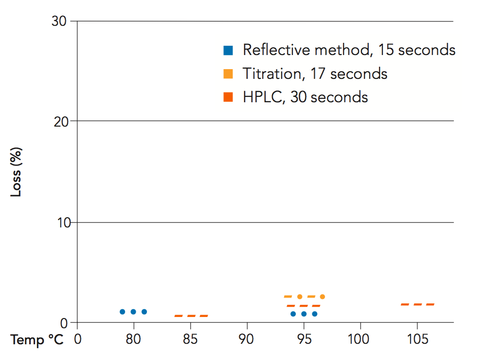 In principle, vitamin C degradation occurs faster as temperature increases, as with many chemical reactions. One might therefore conclude that pasteurization would result in large vitamin C losses. However, the time that the juice is at pasteurization temperature is very short (15-30 seconds). Measurements of vitamin C content in different beverages before and after pasteurization show that vitamin C losses are actually very small. Figure 4.2 shows the results for orange juice at different pasteurization conditions. In the most severe conditions, 105°C and 30 seconds hold time, the vitamin C loss was a mere 2.3%. The evaluations took place both during commercial production and pilot scale trials.