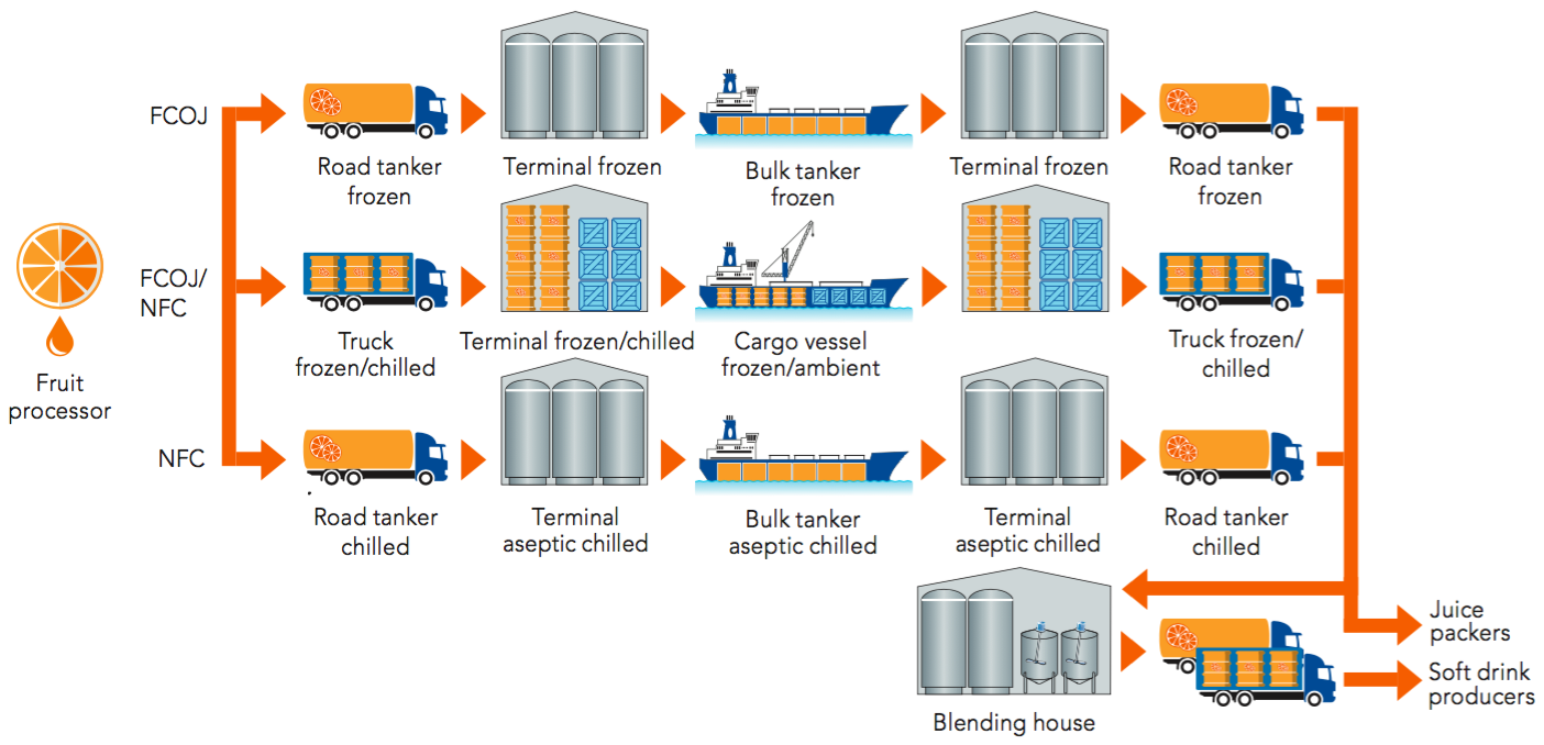 Shipping of orange juice products is dominated by bulk shipments, mainly of frozen concentrate. However, in US significant quantities of NFC are filled in consumer packages in Florida before distribution to other states.